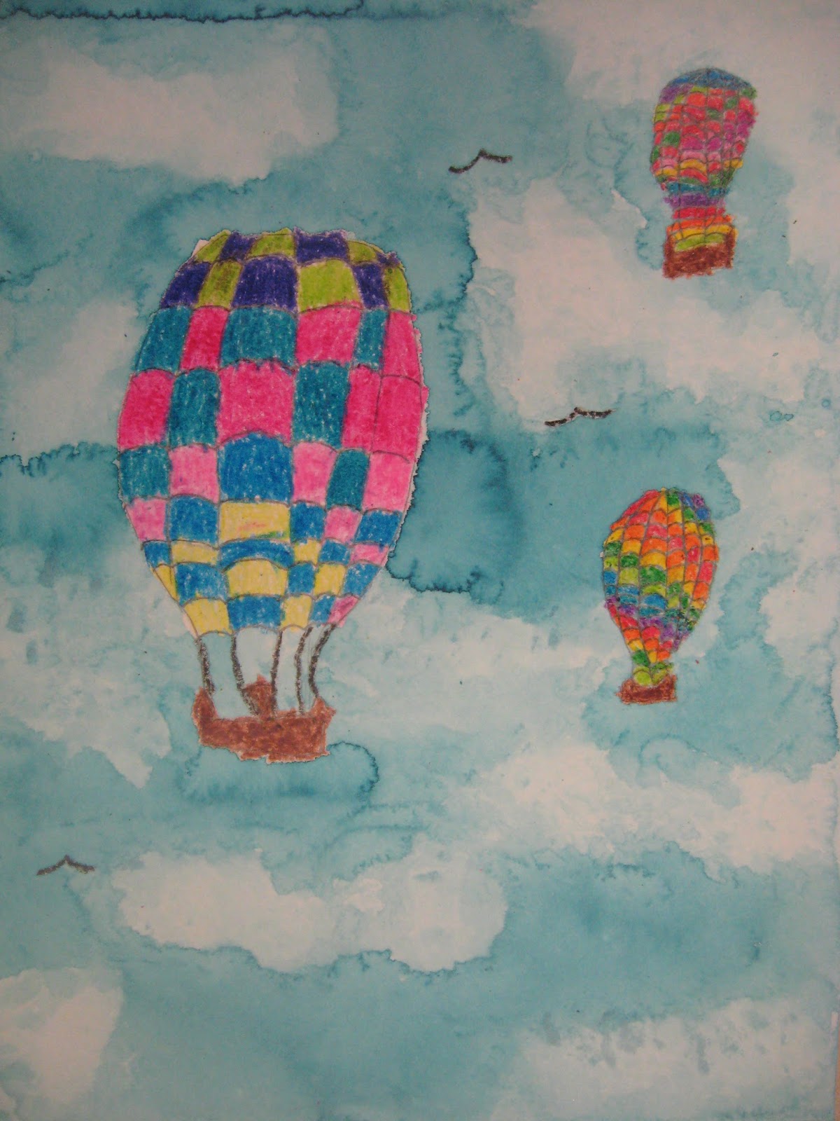 My 5th grade students have been learning about the principle of art pattern. We looked at several photographs of hot air balloons, and noticed the patterns on them, as well as the shape of them. The students drew their own balloons (and any other details they wanted in their art) with crayons on watercolor paper. Then, they painted the sky with liquid watercolors, and used a balled up paper towel to dab away clouds, while the watercolors were still wet. It's a fun watercolor technique with great results, that only works on watercolor paper! Other papers are usually so thin that the paint soaks all the way through.